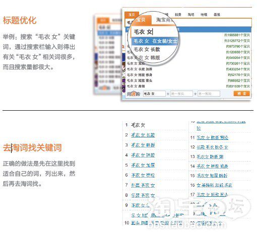 这些搜索出来的词汇属于搜索量大,并和产品不冲突的关键词。其次把这些关键词全部融入到一个宝贝标题里,可以看到组合的一个标题为:“正品 2011 冬装新款韩版宽松 毛衣外套 中长款加厚高领套头毛衣 女”。这个标题基本包含了前面至少25 个有效关键词,因此总结出标题的要求是:关键词要有搜索量、关键词和产品本身匹配、标题要通顺三个基本原理。